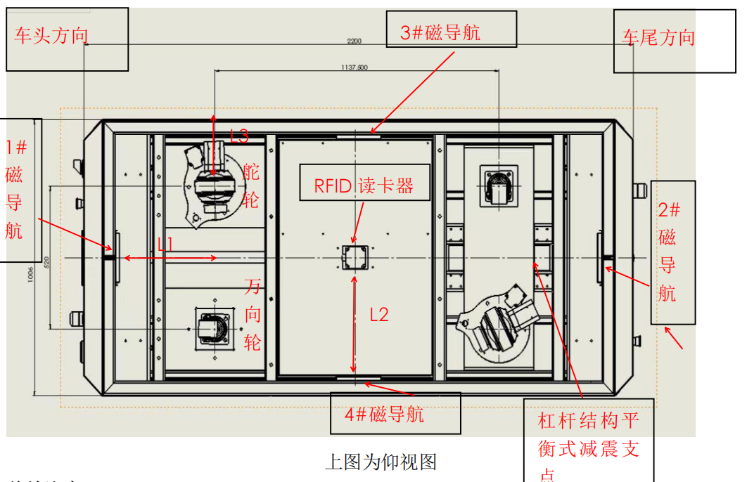 磁導(dǎo)航固定在車體安裝,杠桿結(jié)構(gòu)平衡式減震機(jī)構(gòu)安裝方式如下: